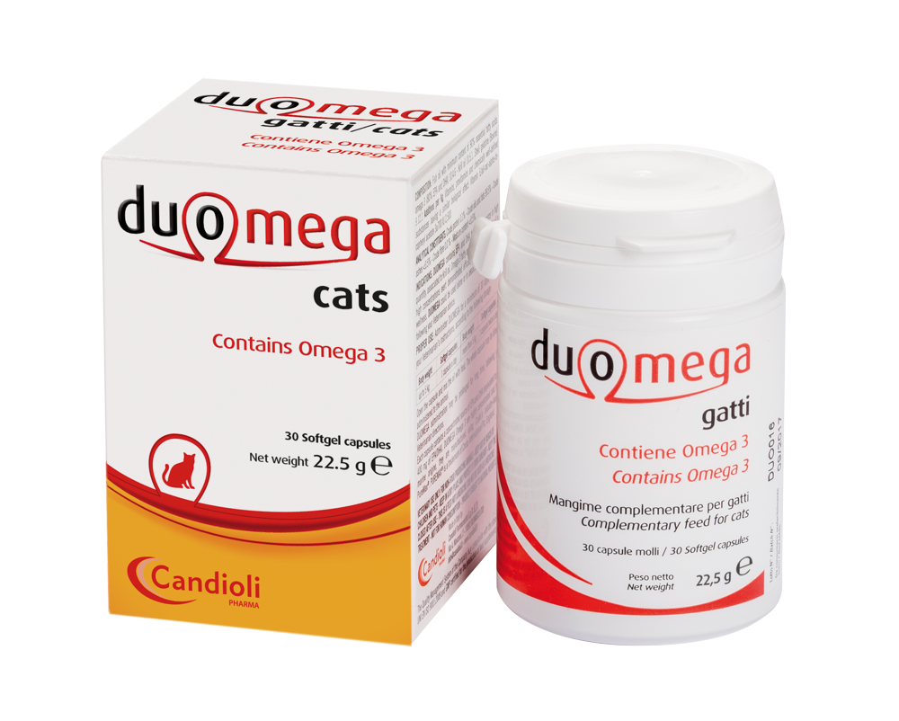 O Duomega Cats é um suplemento alimentar em cápsulas, formulado com ácidos gordos ómega-3 (EPA e DHA) de alta pureza, obtidos de óleo de peixe, combinados com óleo de krill e enriquecido com vitamina E. A sua composição ajuda a manter o bem-estar geral, apoiando de forma especial a função renal e cardíaca em gatos de todas as idades.